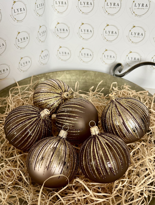 Trendový dekor, moderní zpracování na hnědém podkladu. Sada ozdob obsahuje kombinaci stříbřených a čirých koulí.