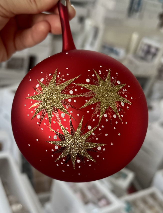 Ozdoba v červené barvě s textem vlastní volby ozdobená zlatými hvězdičkami.