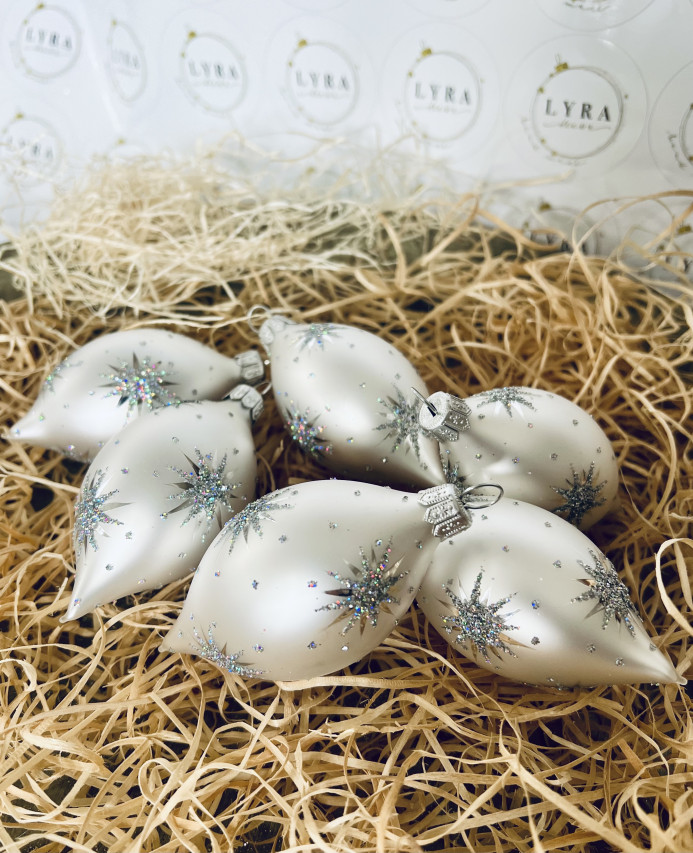 Decentní provedení vánočních ozdob. Moderní kombinace stříbrné koule s ornamentem, který po dopadu světla září různými barvami.