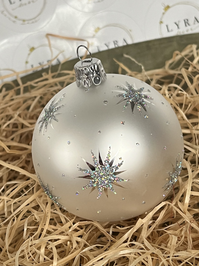 Decentní provedení vánočních ozdob. Třpytivé hvězdičky na perletově bílém podkladu.